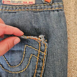 True Religion Bobby Super T Blue Jeans Women's Size 27, 31" Inseam, Low Rise, Flare, Thick stitching, Logo, Made of 100% Cotton, Made in USA. Little Distressed.