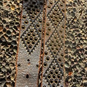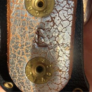 Baltazar silver crackled distressed leather belt with gold grommet and silver stud accents and silver buckle. Buckle has 2 snaps that allow the buckle to be removed. Belt is 1.75” wide.