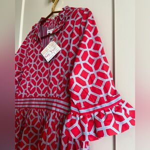 Rendered in a vibrant coral and periwinkle geometric print, this feminine silhouette features a charming ruffle collar, softly flounced sleeves, and a flattering tiered skirt that moves beautifully with every step. Thoughtful details like side pockets and crisp contrast striping add both function and signature Gretchen Scott polish.
