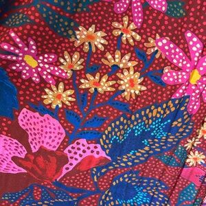 Vibrant and stylish, this dress features a stunning floral pattern. Perfect for any occasion, it combines comfort with a bold fashion statement. Lined. Zips in back. Worn once.