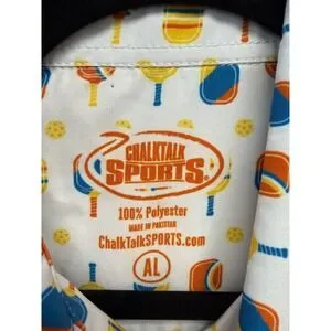 ChalkTalk Sports button-down shirt showcases a vibrant, all-over pickleball paddle and ball print in orange, blue, and yellow. Crafted from lightweight 100% polyester, this short-sleeve top offers a breathable feel perfect for active days or casual outings. The design includes a classic button-down collar, a single chest pocket, and a curved hem for a polished yet sporty look. Ideal for pickleball enthusiasts looking to bring their passion for the game into their everyday wardrobe.