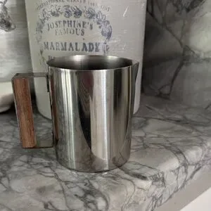 Enhance your kitchen with this sleek stainless steel mug featuring a stylish wooden handle.