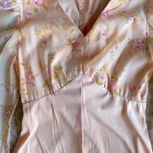 This vintage handmade dress is both gorgeous and one of a kind. It is peach with an A-line/mermaid like skirt and a peach and pink floral overlay on the V-neck top with beautiful sheer bell sleeves. Zips down the back for easy on and off. No size tags but fits like an XS/S. Measurements are 17” PTP & 13.5” flat waist. Fabric in skirt has some stretch to it. This would be so pretty for prom or homecoming, a bridal shower, engagement party, cocktail party, Easter & more. In excellent vintage condition with no visible stains or flaws. It truly is so pretty, feminine & unique. Don’t miss out on this one of a kind dress!