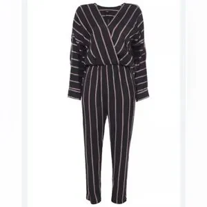 MAJE Pandomi Black Striped Woven Wrap Jumpsuit Size Large. Maje Size 2 = medium, reference Maje's size chart shown. V-neck. Long dolman sleeves. Wrap-over panel at front. Elasticated waistband. Two slip pockets at sides. Straight hem. Notched cuffs. Concealed popper fastening at front.