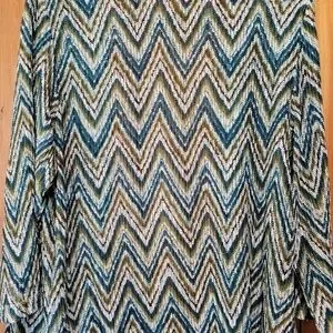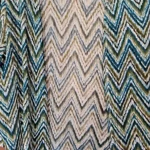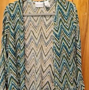 Stylish chevron cardigan with a mix of green, blue, and tan colors. Perfect for layering.