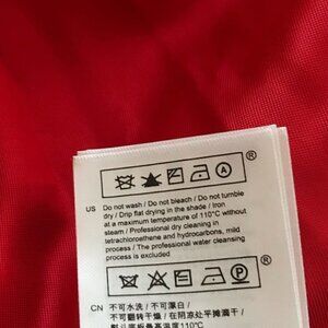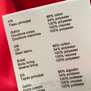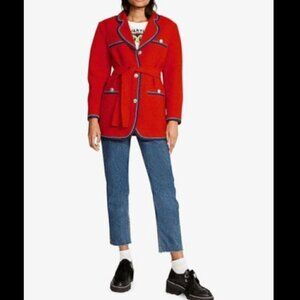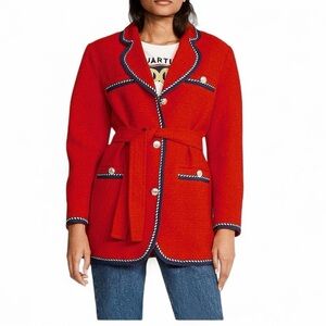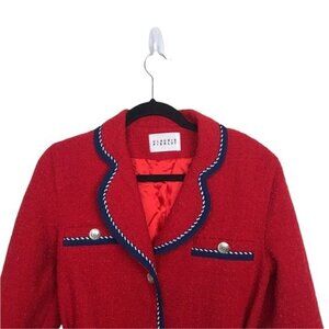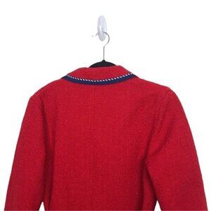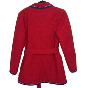 Red, tweed coat with contrasting braided trims and logo-engraved buttons that nod to marine styling. It's softly tailored with rounded notch lapels and a tie waist belt. Can be dressed up or down. Preowned with minor pilling but still in good condition. Dry Clean Only