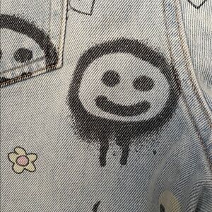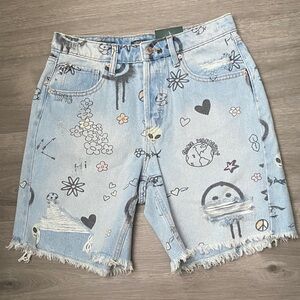 Trendy light blue denim shorts with playful graphics. Features frayed hems and a relaxed fit distressed