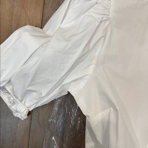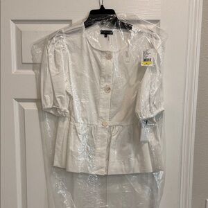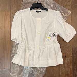 Elegant cream blouse with button front. Puff sleeves add charm. Perfect for any occasion.
