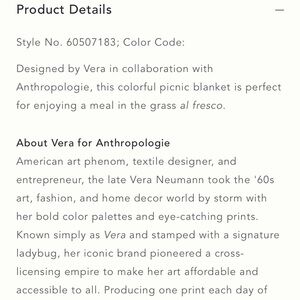 This colorful picnic blanket is perfect for enjoying for enjoying a meal in the grass al fresco. Iconic Vera bold patterns. Constructed of heavy cotton twill, including a carry case of the same. Tie down tabs, stakes not included. Great for picnics, concerts in the park, a day at the beach, nap blanket for kids play date. The options are truly endless.