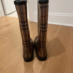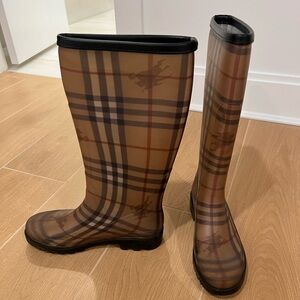 BURBERRY Authentic Rubber Printed Rain Boots.Very Good used condition. I bought at Neiman Marcus for $350.00. Size 38 but I’m a size 7 and they fit me.