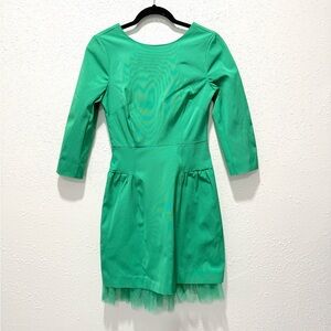 a J.Crew long-sleeve sheath dress with a tulle hem in bright Kelly green satin dress