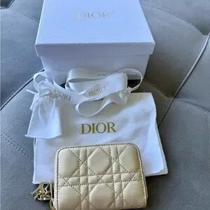 Small Lady Dior Voyageur Coin Purse in Gold Cannage Lambskin. New and never used. Comes with pouch for removable charms, dustbag for wallet plus Dior box, ribbon, and charm