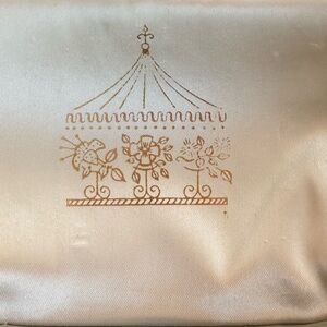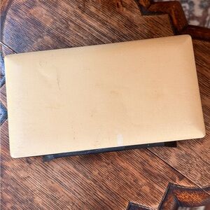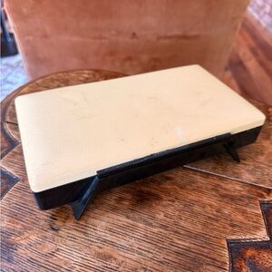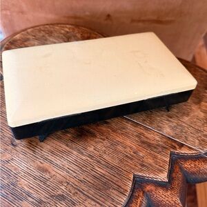 Vintage Farrington jewelry box, likely from the 1950s, featuring a dark cream cushioned lid and a black base.