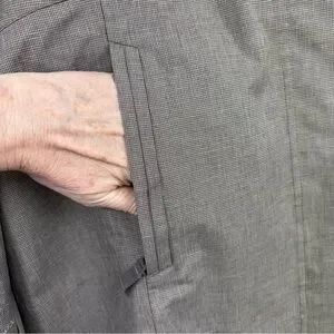 Stylish brown rain coat with a hood. Fully lined. Zip pockets at each hip and one inside the jacket. Perfect for versatile wear. Offers comfort and elegance.