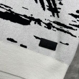 Waggle Loon Call Wildknit Crewneck sweater features a bold, graphic intarsia-style knit of loons in a striking black and white colorway. Crafted from a comfortable cotton-polyester blend, this long-sleeve pullover offers a relaxed fit with ribbed cuffs and hem for a structured silhouette. A subtle branded metal plate near the hem adds a premium touch to this unique wildlife-inspired piece.