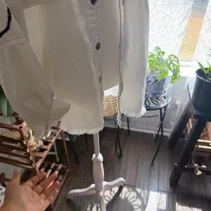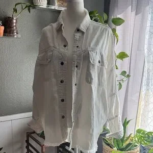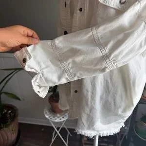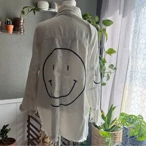 oversized white cotton button-up shacket featuring a stitched happy face graphic on the back and arm.