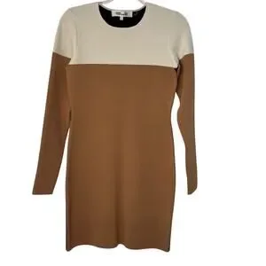 Diane Von Furstenberg Womens Size Small Merino Wool Blend Sweater Dress Tan Black Cream Colorblock Long Sleeve Stretch Mini Body Skimming Silhouette