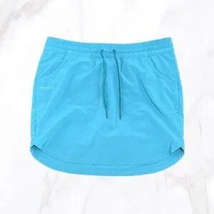 This sporty Marmot skort combines the look of a skirt with the comfort of built-in shorts—perfect for active days with a feminine twist. Crafted from lightweight, quick-dry nylon fabric with a subtle sheen, it features an elastic/drawstring waistband for adjustable secure fit, side pockets (one with zip closure), built-in compression shorts liner in contrasting black, curved hem for flattering movement, and a short length that offers coverage without restricting stride. The bright turquoise color pops while the Marmot logo embroidery adds subtle branding—ideal for hiking, tennis, golf, running errands, travel, or casual athleisure outfits. Made in Vietnam. In excellent pre-owned condition—fabric clean and smooth with no major stains, tears, or pilling; drawstring and zipper function perfectly, light normal wear (minor storage creasing), no odors. Great shape and ready to wear! Perfect for outdoor activities, gym sessions, casual summer days, or travel—pairs effortlessly with tanks, tees, hoodies, sneakers, or athletic sandals for functional, stylish looks.