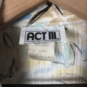 Vintage Pastel Palm Leaf Blazer. From the brand Act III. Features a sketchy pastel palm leaf print. 3/4 length sleeves with rolled cuffs. Notched collar. Two front pockets. 50% cotton, 50% polyester. Made in USA. Size is listed as 7/8. Please see measurements.
