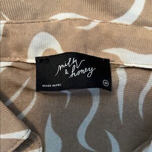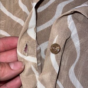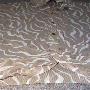 Stylish beige and white patterned blouse. Features a button-up front and short sleeves. Perfect for casual wear on a hot summer day!