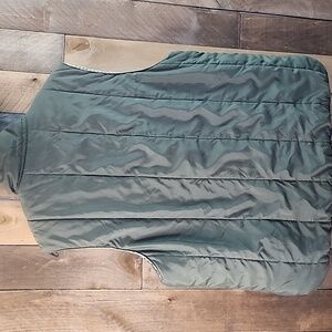The garment features a solid green exterior with vertical quilting and two slanted side pockets.