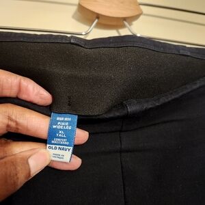 Chic and versatile classic black wide leg pants by Old Navy, size XL tall. Comfortable fit with a stylish look. The stretchy profesh pant you love, with extra leg room. Elasticized waist, front pockets, faux-welt back pockets and super wide leg. Official color is Black Jack. Fabric blend of cotton, rayon, viscose and spandex. Excellent pre-owned condition; no flaws.