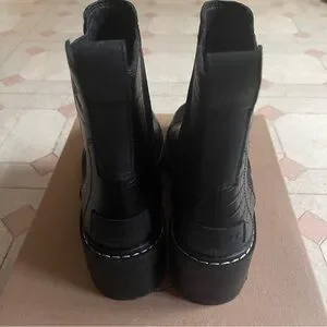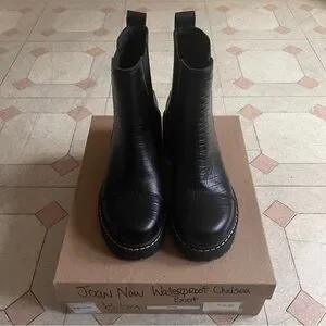 Classic Chelsea boot style in a croc embossed leather, and functional for harsh weather because they are waterproof! Features a chunky heel and contrast stitching around the midsole. Only worn once and in like new condition!