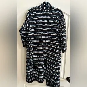 Elegant black and white cardigan with intricate patterns. Open front design. Ideal for layering.