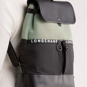 A contemporary backpack features sporty textile with leather trim and soft webbed shoulder straps to serve as a sophisticated commuter essential. Longchamp's slim profile brings modern design with pockets inside and out for adaptable storage.