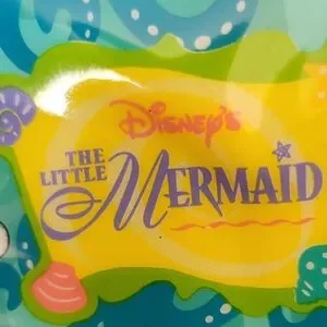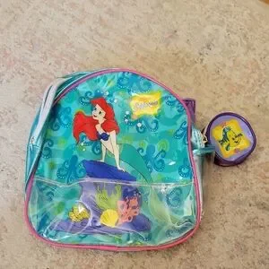 Vibrant plastic Disney backpack with Ariel and Flounder. Features teal and purple hues. Ideal for Little Mermaid fans. 🧜♀️