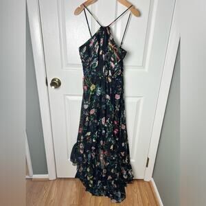 The Halter High-Low Gown is an a-line high-low gown featuring a delicate halter neckline, pleated bodice, and tiered ruffle hem. The sleeveless dress is complete with an intricate all-over print of flowering branches.