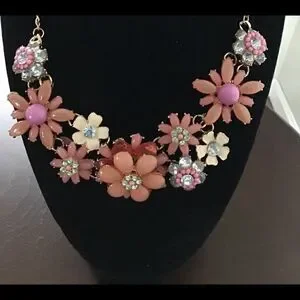Beautifully handcrafted bib statement necklace. Embellished with sparkling stones & rhinestones accented in a gold setting. Peach & pink & white colored stones make this perfect for Spring. Adjustable goldtone chain