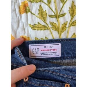 Like new condition (never worn), High Rise Stride Jeans from GAP, women's size 35 (20R). These denim jeans feature a dark blue wash, classic 5-pocket design, wide leg, and high rise waist. Made from 99% cotton, 1% elastane blend. Incredibly comfortable, stylish, and flattering.
