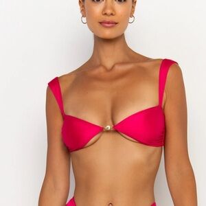 Brand new with tags Sommer Swim Soriya Magenta balconette bikini top with matching cheeky bottoms, both size small. Stunning hot pink/magenta shade with luxe gold hardware detail at the center of the top and gold chain accents on the bottoms. Flattering structured balconette style with supportive straps and a cheeky, high cut fit that elongates the legs.