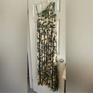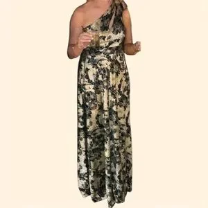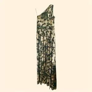 Betsy & Adam One-Shoulder Gold & Black Gown Dress Green Metallic Sheen Size 10