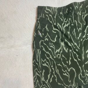 Design: This cargo skort features a dark and light green organic botanical camo pattern, blending olive and eucalyptus green hues. It has a skirt overlay with built-in shorts underneath for added coverage and mobility.
