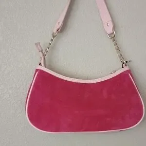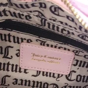 Elegant Juicy Couture shoulder bag in pink. Features gold chain strap and crown embroidery. Includes heart charm detail.