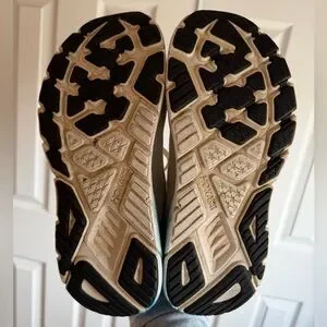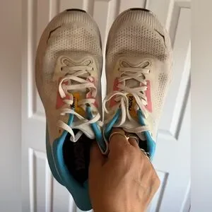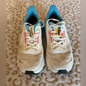 White Hoka sneakers with sky blue details.The pink accents add a vibrant touch. running shoes, size 9.5B. In very good condition, they show signs of use and stains, as is normal for used footwear, but they function perfectly. See photos.