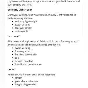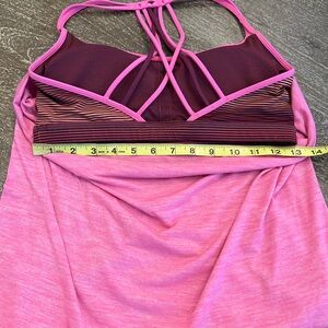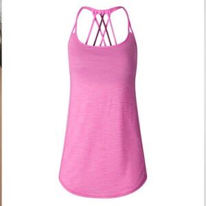 Stylish 2 in 1 breathable tank top. Features a strappy and slouched back design. Ideal for light workouts like yoga. Built in sports bra has removable padding. See photos for measurements. There are NO tags on the top.