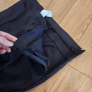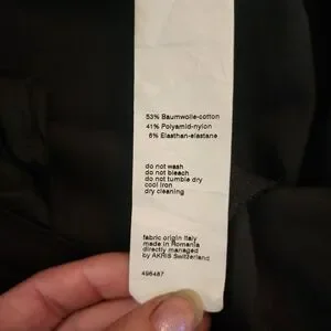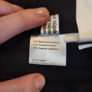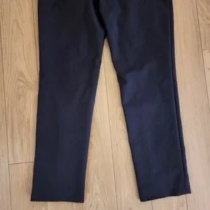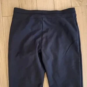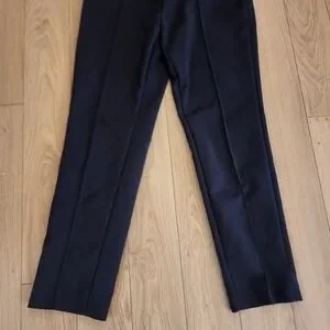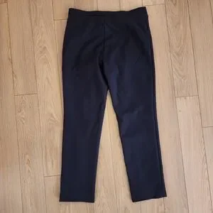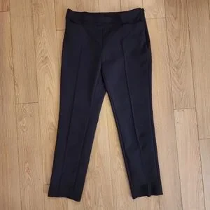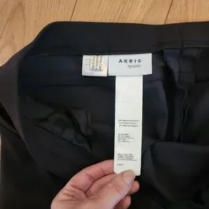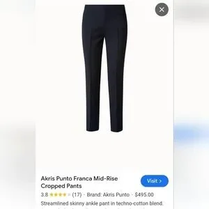 Pre-loved Akris Punto Franca Mid Rise Cropped Pants. Size 8, no stretch in the waist, but has stretch in the legs, see measurements. Has zipper at the left side. Has front pockets. Color is black. Straight leg. Raised seem details down the front of the legs. Made with techno-cotton. RN# 496487.