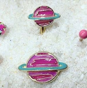 You're not seeing double, that's two Saturns. Featuring a large planet on the bottom with a smaller twin on the top. Both are inlaid with hot pink and purple with the rings inlaid in bright green. The overall color scheme is strikingly vivid but not the least bit overwhelming or gaudy. Space is for the bold, just like this boldly colored belly button ring!