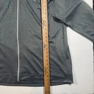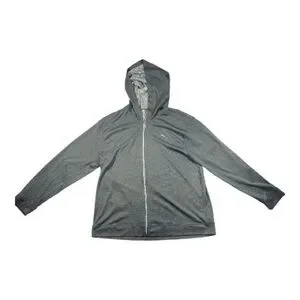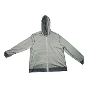 This item comes with no id tags or sizing.It is a lightweight material, assuming a poly, nylon spandex blend. A very light jacket.