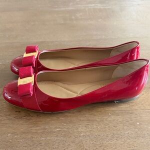 Chic red patent flats featuring a stylish bow accent. Ideal for a sophisticated look.