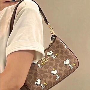 Tan shoulder bag with Snoopy print. Features gold-tone hardware and detachable strap.