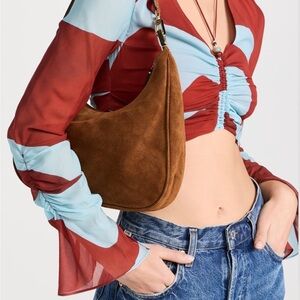 This shoulder bag from STAUD is crafted from cowhide suede and features a hobo silhouette, zip closure at top, and convertible strap. The brand's modern approach to classic shapes is evident in this bag's relaxed structure and rich suede texture, making it a refined addition to any accessory collection.