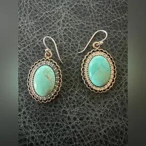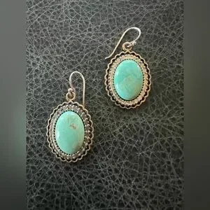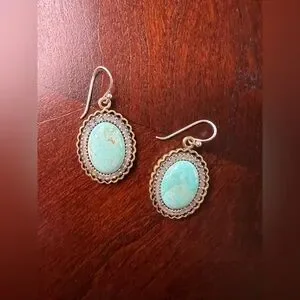These earrings feature oval-shaped light blue/green turquoise stones, each measuring about 1/2 x 3/4 inches. The setting is crafted from bronze with silver overlay. The hooks are made from 100% silver. These statement earrings are lightweight and very elegant.