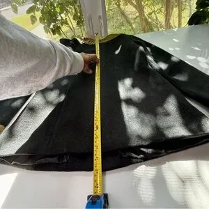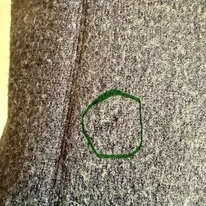 Please see photos. There is a small, barely noticeable mark on the back, and the cuffs of one sleeve are worn.