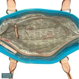 Bold, vibrant, and instantly recognizable, this Kate Spade Rudy Henry Street tote in Brightpeac Turquoise is a playful statement piece with modern glam appeal. Featuring a glossy patent exterior and iconic newspaper print lining, this discontinued and sold-out style is both collectible and functional.