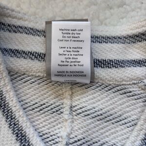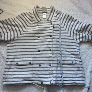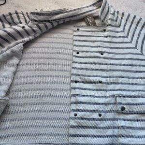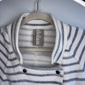 Gently used Anthropology Dolan Left Coast Stripes of navy blue on a creamy ivory white. Front deep pockets with snap closure. Double breasted snap closure at front. Rope drawstring toggles at hemline. Roll tab sleeves with snap cuff. Size Large