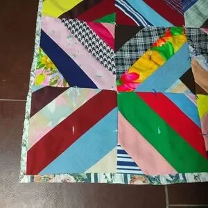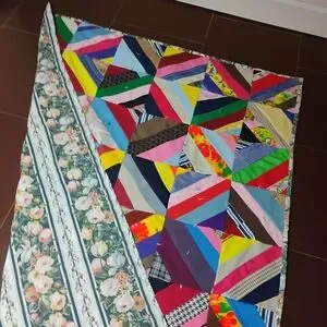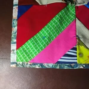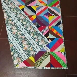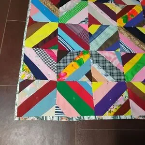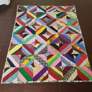 Features a vibrant, colorful patchwork design with bold diagonals and rich mixed fabrics. A warm, eye-catching piece that adds character to any space.